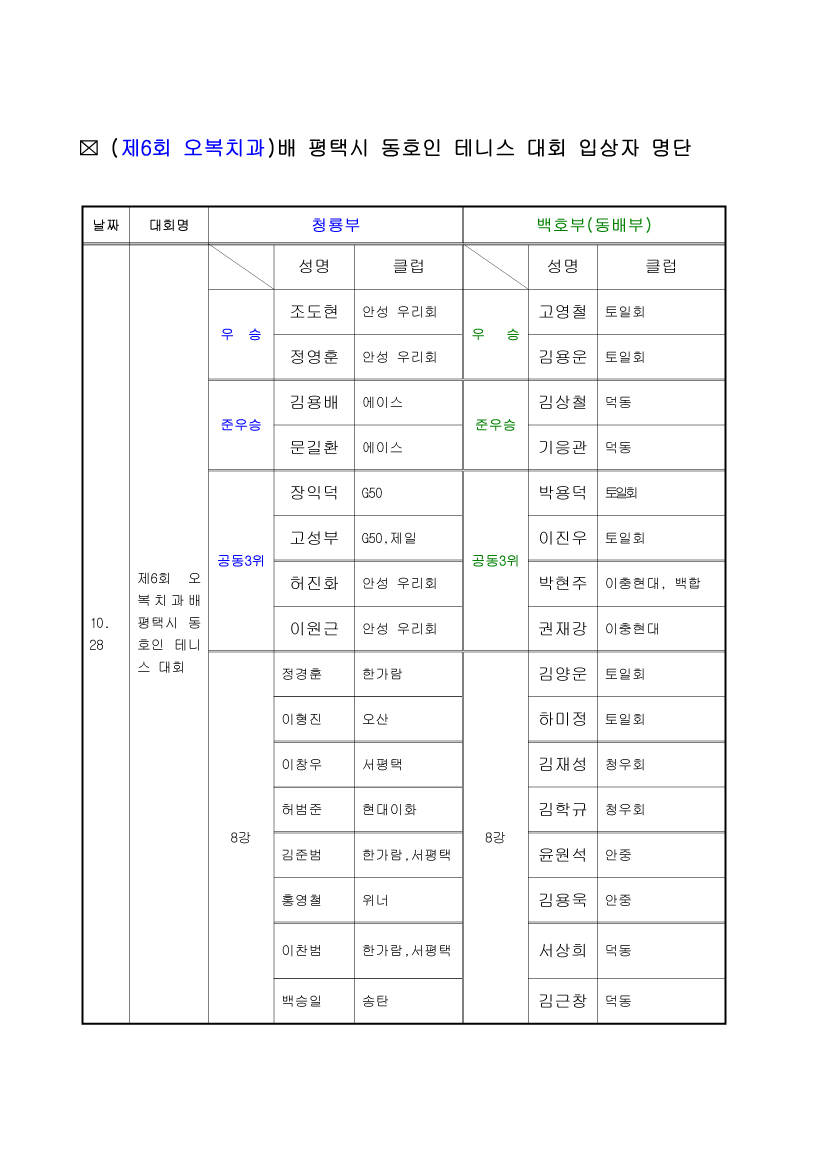 Á¦6ȸ ¿Àº¹Ä¡°ú¹è ÆòÅýà µ¿È£ÀÎ Å״Ͻº ´ëȸ(2012.10.28)