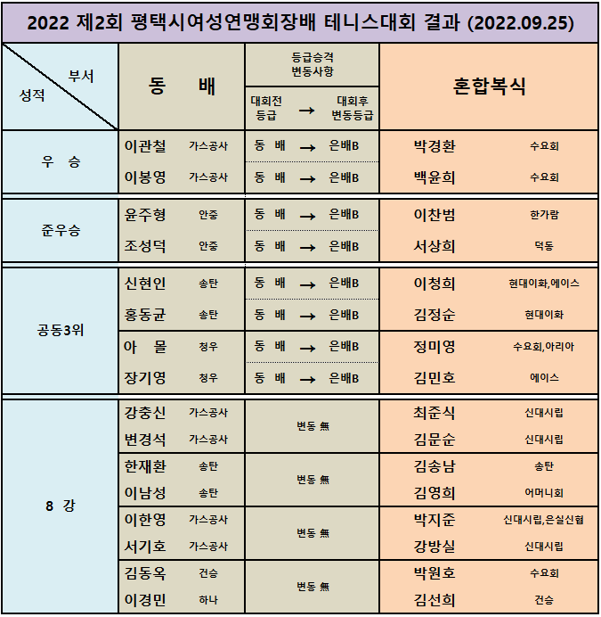 2022 Á¦2ȸ ÆòÅýÿ©¼º¿¬¸ÍȸÀå¹è Å״Ͻº´ëȸ °á°ú (µ¿¹èºÎ ½Â±ÞÆ÷ÇÔ)(2022.09.25)
