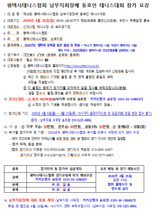 Á¦20ȸ ÆòÅýÃÅ״ϽºÇùȸ ³²ºÎÁöȸÀå¹è µ¿È£ÀÎÅ״Ͻº´ëȸ Âü°¡¿ä° ¹× µî±ÞºÐ·ùÇ¥ °øÁö